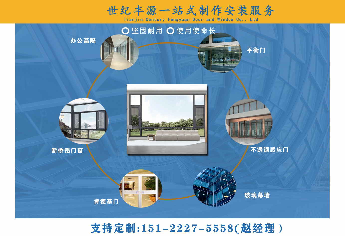 天津世紀豐源門窗有限公司從事斷橋鋁門窗,玻璃幕墻,平衡門,肯德基門,不銹鋼感應門,百葉窗,辦公高隔,制作安裝一站式訂制生產(chǎn)及配套服務等。 公司自成立以來,始終堅持以人才為本、誠信立業(yè)的經(jīng)營原則,薈萃業(yè)界精英,成熟的技術(shù)、管理方法及企業(yè)經(jīng)驗與國內(nèi)企業(yè)的具體實際相結(jié)合,為企業(yè)供給各個方面的解決方案,使企業(yè)在激烈的市場競爭中始終堅持競爭力,實現(xiàn)企業(yè)快速、穩(wěn)定地發(fā)展。 質(zhì)量好、服務好、才能信譽好,公司已在諸多領(lǐng)域取得輝煌成績,愿意成為您可信賴的長期合作伙伴。 讓我們攜手同行,共同實現(xiàn)“讓普通老百姓都用得上高端門窗”...